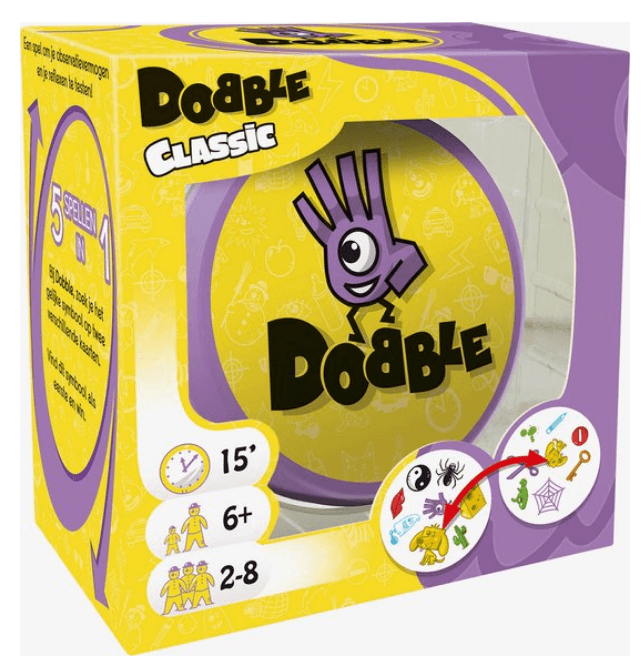 Een kaartspel met 55 kaarten, 57 symbolen in totaal en 8 symbolen per kaart. Elke twee kaarten hebben één symbool gemeen die u moet vinden en benoemen om te winnen! Ontdek in totaal 5 mini-games en uitdagingen om samen te spelen. Dobble is een spel dat concentratie en observatie stimuleert.