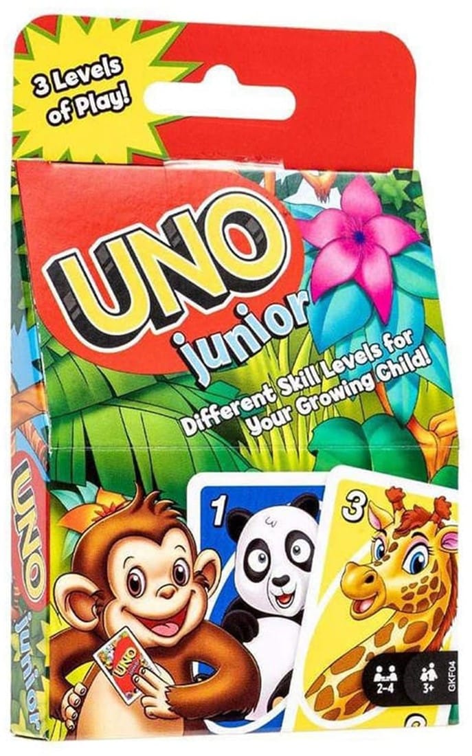 UNO Junior is de kindvriendelijke versie van het populaire UNO® kaartspel. Het spel is speciaal ontworpen voor kinderen vanaf 3 jaar en bevat 45 kleurrijke kaarten met schattige dieren. Dankzij de vereenvoudigde regels en drie oplopende spelniveaus groeit UNO Junior mee met de ontwikkeling van je kind. Het compact formaat maakt dit kaartspel ideaal om mee te nemen op vakantie, naar opa en oma of voor een middagje spelen thuis.